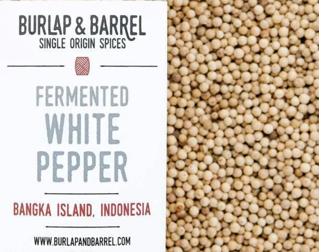 Burlap and Barrel Fermented White Pepper comes from a family farm on the island of Bangka, Sumatra, Indonesia. It's grown by a farmer named Pak Sugiri and his son, Ilham. It is picked fresh and then fermented according to traditional methods, using the fruit of the fresh peppercorn. Highly prized in Indonesia but rarely found in the US, Fermented White Peppercorns add a deep umami flavor and funk to everything they touch. Grind over steak to mimic the flavor of dry aging, over veggies for heat and depth, or in traditional Cantonese and Southeast Asia dishes that call for white pepper. Cooking Tips: Substitute for black peppercorns where you want a funky kick Grind over seafood dishes (especially good in crab cakes) Add to blended vegetable soups, like potato or cauliflower soup.