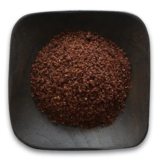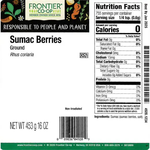 Frontier Co-op Bulk Ground Sumac Berries offer a deeper flavor exploration into international seasonings with a traditional Middle Eastern spice that adds both tangy flavor and appealing color to a variety of foods — meats, vegetables and hummus.