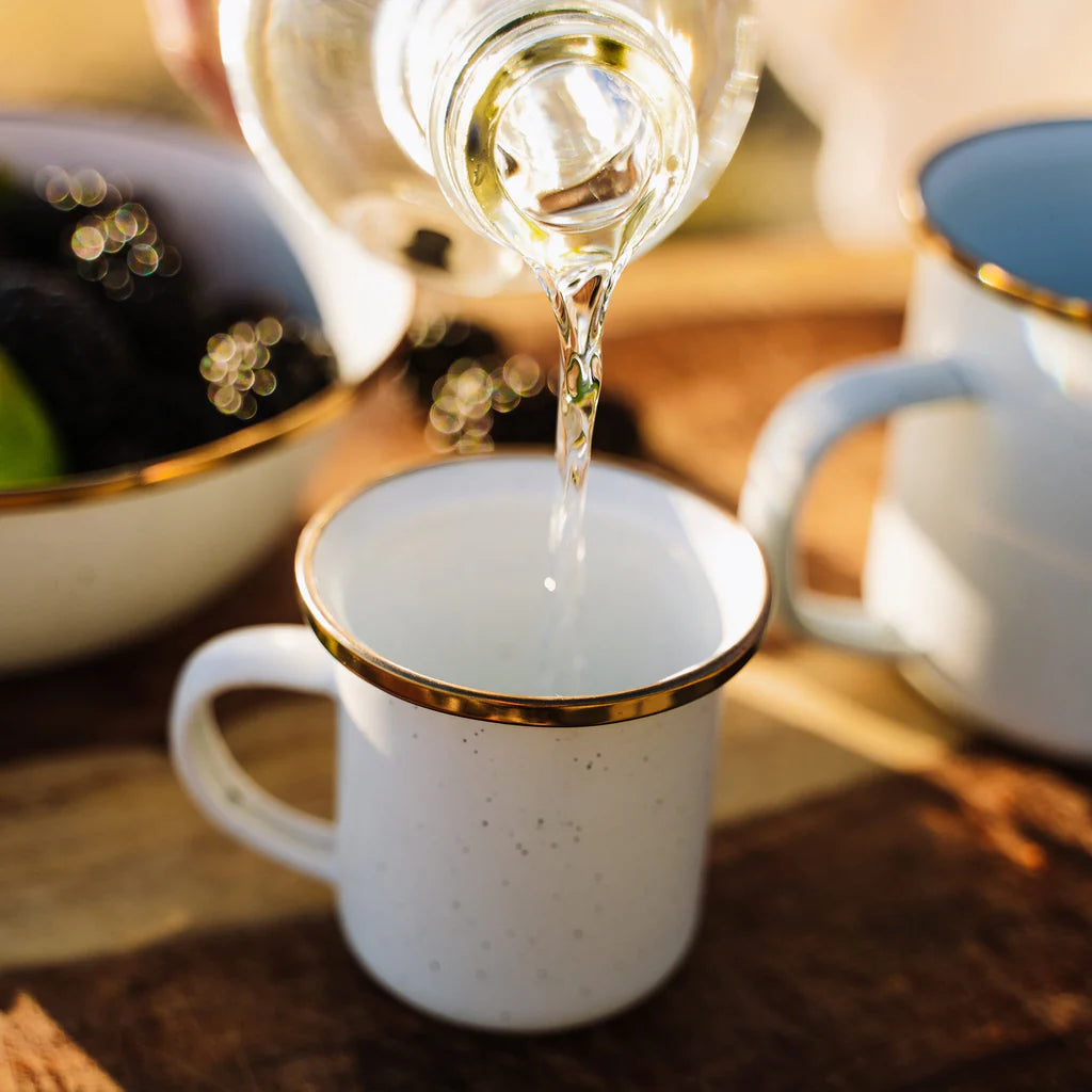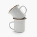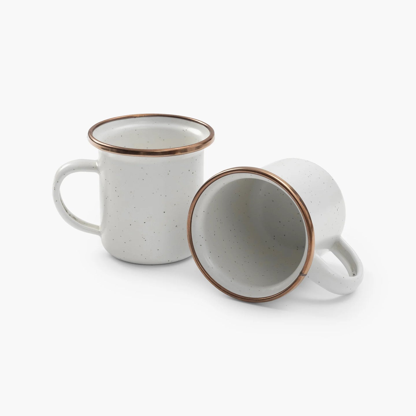 Each enamel espresso cup set features a speckled enameled surface hand-finished baked stainless steel rim creating a bronze-like patina finish, resulting in unique pieces that form a cohesive set.