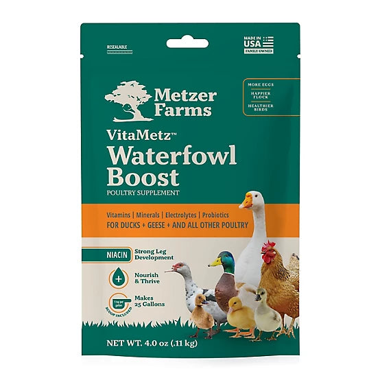 VitaMetz is a comprehensive blend of vitamins, electrolytes, trace minerals, and beneficial bacteria specially formulated for ducks and other waterfowl. It's the ultimate nutritional boost in a convenient, easy-to-administer package, designed to support waterfowl of all ages during times of stress or during periods of reduced feed consumption.
