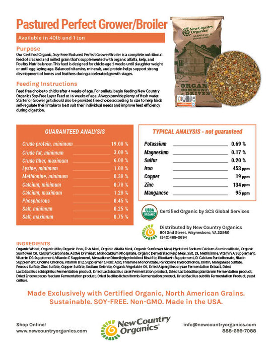 A Complete Feed Specifically Balanced for Pastured Poultry Simpler Formulation with Fewer Ingredients Great Value and Corn Free Certified Organic, Soy-Free, Low Starch 19% Protein Pastured Perfect Grower/Broiler Feed is a complete nutritional feed of cracked...Regular price $39.99 -