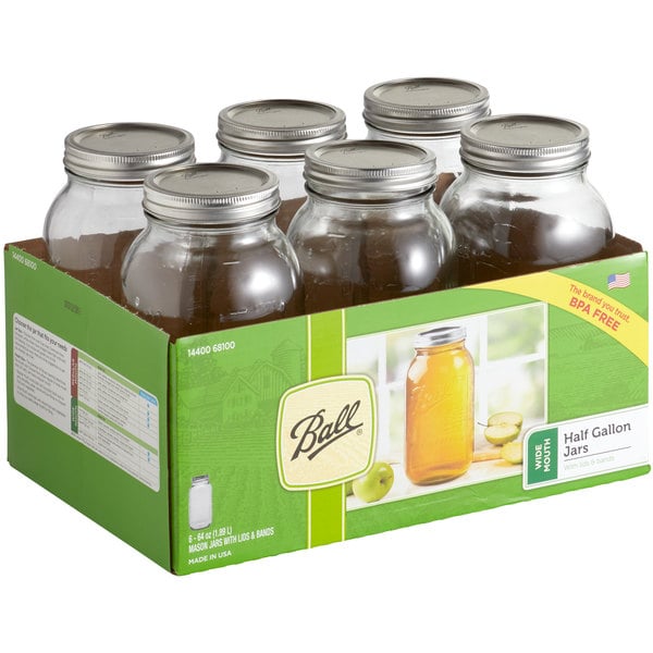 Ball 64 oz. Half Gallon, Wide Mouth Glass Canning Jar with Silver Metal Lid and Band - 6/Case