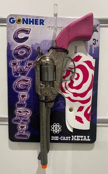 COWGIRL 8 SHOT DIECAST FILIGREED CAP GUN WITH HOLSTER - STEEL & PINK This cap-firing toy filigreed revolver features break-open action, great detailing and durable construction. Release the catch to open the cylinder, load 8 Shot Ring Caps (not included) on to the cylinder and close to fire! Features: Die-cast Metal Construction with Plastic Grips Fires 8 Shot Ring Caps (not included) Length: 7.75" Gun has the full orange tip as required by the law Manufactured by Gonher in Spain