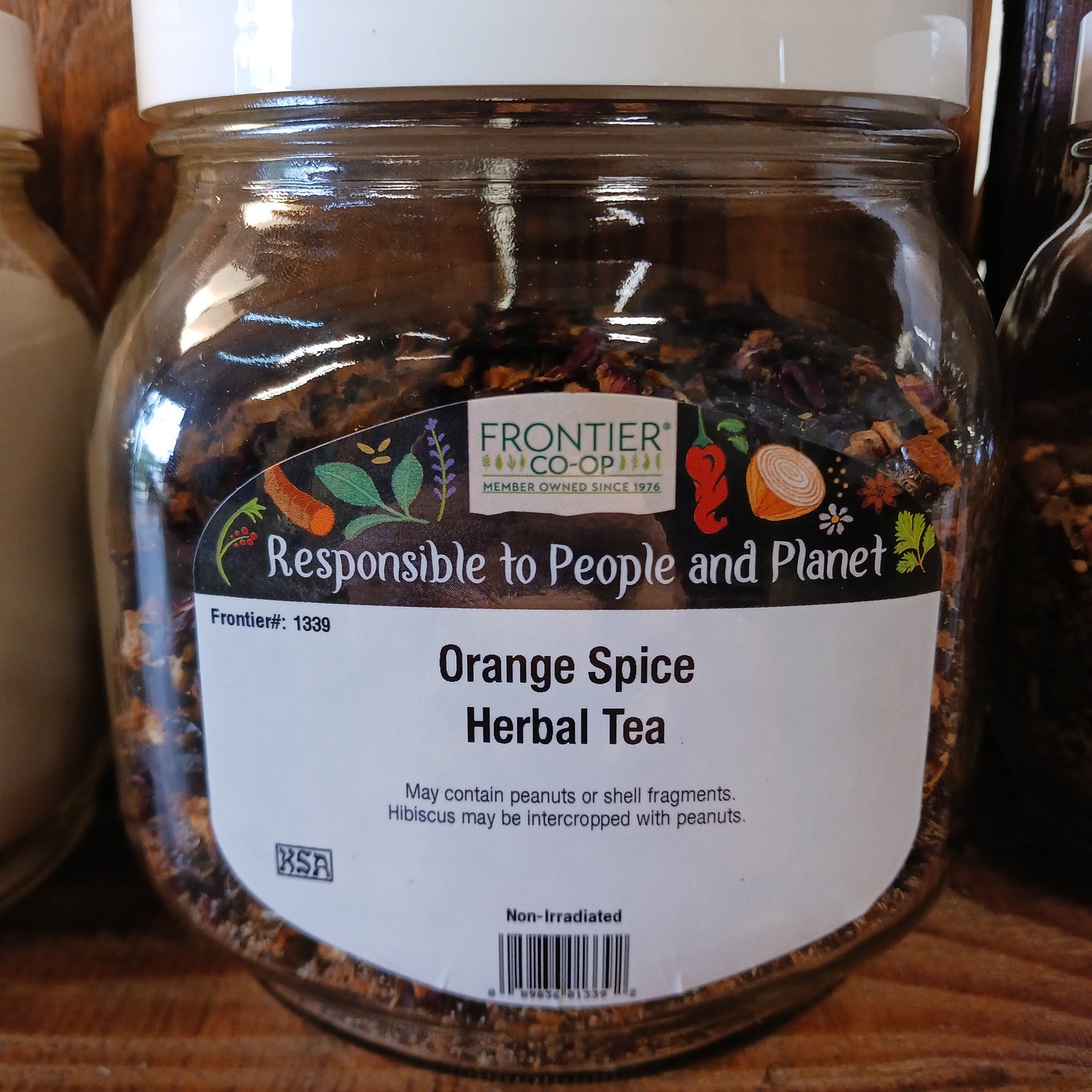 Rich caffiene-free tea blend featuring orange peel, red rosehips and whole cloves, with bits of green blackberry leaf and chicory granules. Spicy, citrus aroma. Cinnamon-red hued infusion.