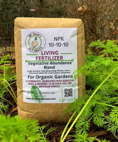 Dr. Dave's Ultimate Living Fertilizer “VEGETATIVE ABUNDANCE BLEND” with NPK = 10-10-10, the highest numbers to date in an organic blend, is OMRI-listed for organic use and represents the culmination of 60 years of organic gardening experience and many analyses of the formula by the University of Georgia Soil Laboratory. It is designed for heavy-feeders like broccoli, cauliflower, kale, collard greens, lettuce, spinach, rhubarb, corn, grasses, cabbage, arugula, Swiss chard, celery, asparagus, Asian greens, and non-blooming shrubs and house plants. See OMRI.org for more information.