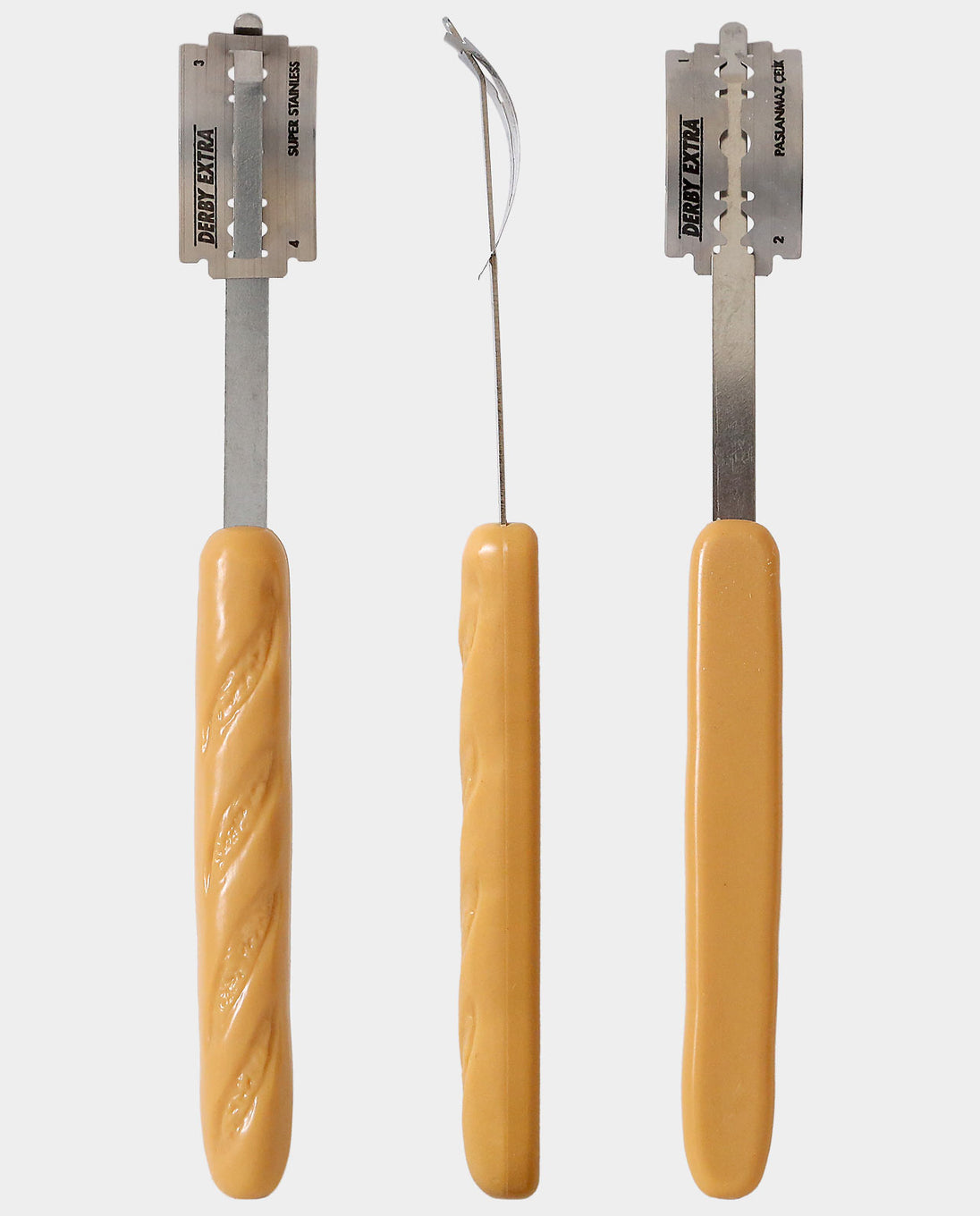 "A Lame (pronounced LAHM, meaning “blade” in French) is typically a long thin stick made to hold a metal razor used to cut, or score, bread dough to help control the expansion of the loaf as it bakes. We have not carried a bread lame prior to this one because we were unable to find one that we liked. They were either over priced or disposable. To work well, the blade needs to be extremely sharp, so a replaceable blade was a necessary feature of an acceptable lame. We also wanted to carry a lame that was reasonably priced. So we made our own." - Breadtopia