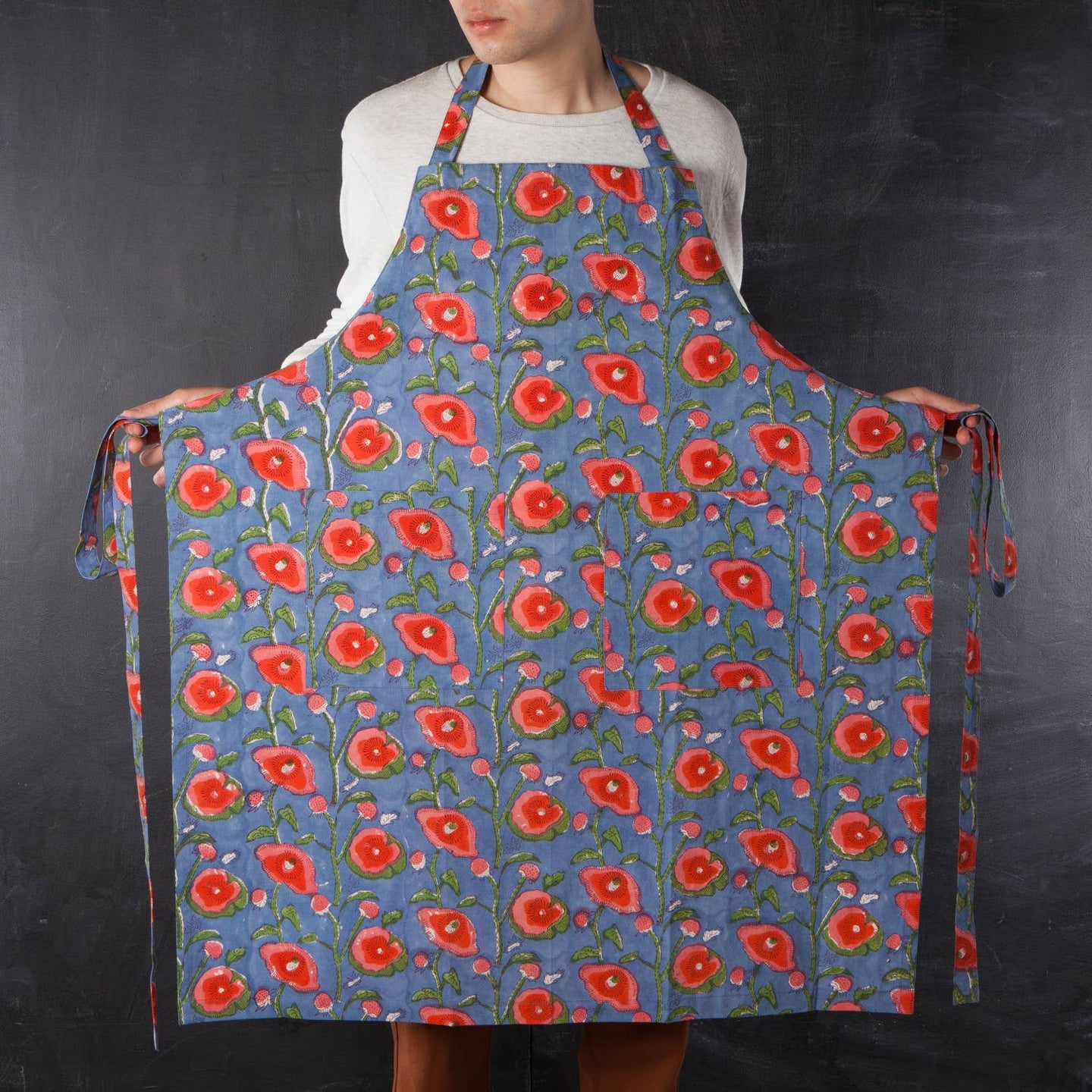 Hand block printing holds a long and rich history in Indian textiles. It’s a skilled craft, shared from generation to generation. Each hand-carved wooden block is stamped in ink and applied with expertise to the fabric creating complex, interconnected patterns. When you wear a hand-block-printed apron, the artistry shines through, and the beauty can be found in the variations of each print. • Size: W31.5 x L36in • Material content: 100% Cotton. • Care instructions: Machine wash cold, tumble dry low, high iron, do not bleach. • Due to the handmade nature of this product, there may be slight variations in color, texture, and finish to each unique, perfectly imperfect item.