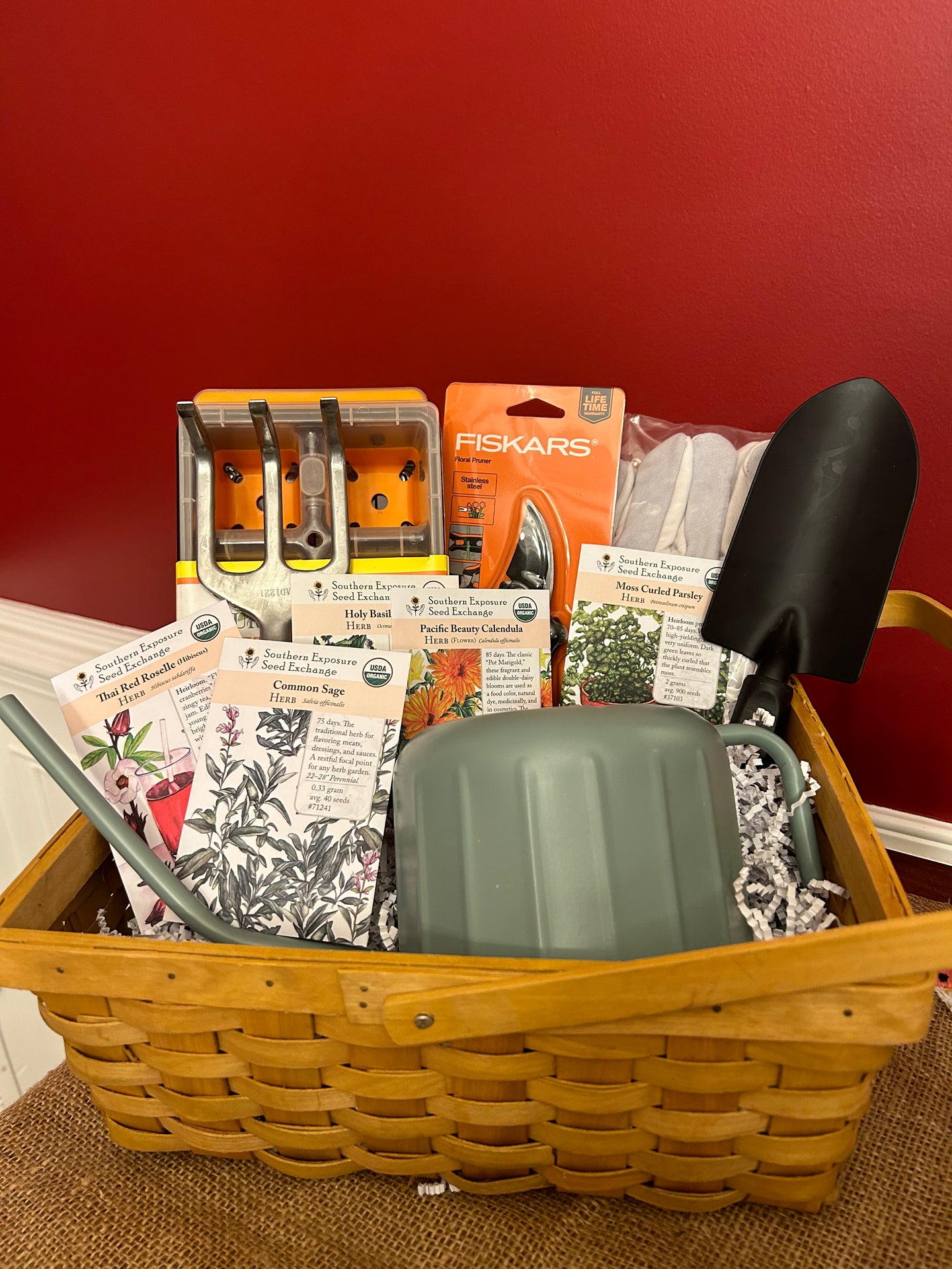 Valued at over $90, this basket includes 5 organic seed packets of herbs from Southern Seed Exchange; a trio of tools from Fiskars: trowel, pruners, and cultivator; a watering can; heavy-duty gloves; and a seed starting tray. Just add dirt and water…