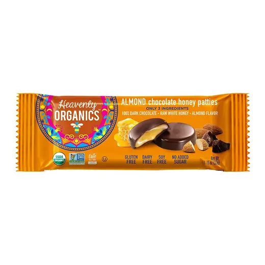 Almonds abound! Heavenly Organics' 100% Organic Almond Honey Patties are a blend of velvety, white honey and almond, enrobed in a 100% cocoa dark chocolate shell. With only three simple ingredients, you're free to indulge…without the guilt.