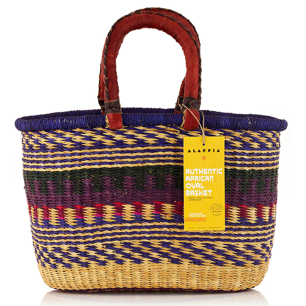 Oval baskets full of colorful fabrics are traditionally part of dowries in West Africa. Created in Bolgatanga, Ghana in 12 villages with more than 5,000 women basket weavers, the Alaffia weavers work independently in a creative process. Members of Alaffia basket cooperatives receive fair wages and health care for their families in return for indigenous skills and knowledge. The weavers craft the baskets in their own homes, and Alaffia collects the baskets once they are completed. This gives the weaver flexibility to work at a pace that is convenient for her, her farm, family and social community duties. Because Alaffia collects the baskets at the weavers’ homes, the women do not have to sell their baskets at the open market as is the case for weavers that are not part of the Alaffia Collectives. This exchange empowers West African communities and preserves cultural heritage.
