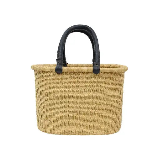Handwoven oval flat bottom grass basket with 2 handles. Ethically sourced from cooperatives in West Africa. Made with wild-harvested Savannah grass. Each basket is completely unique and the leather tag inside is personally signed by the weaver. Please note that given the unique handcrafted nature of each basket, there are no two alike. Colors and patterns will vary.
