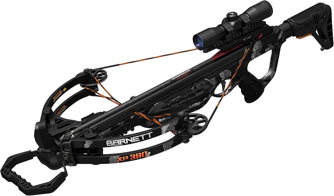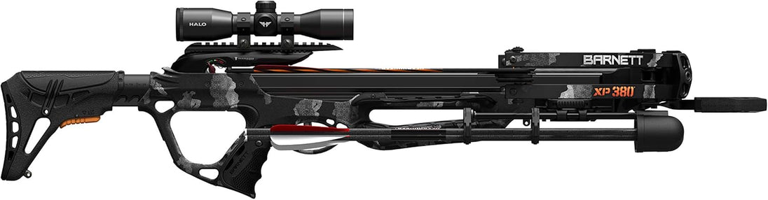 - Compound crossbow with complete hunting accessory package in Black Strike Camo. Explorer XP380 features a pass-through foregrip, adjustable butt stock, and reaches menacing speeds of up to 380 feet per second